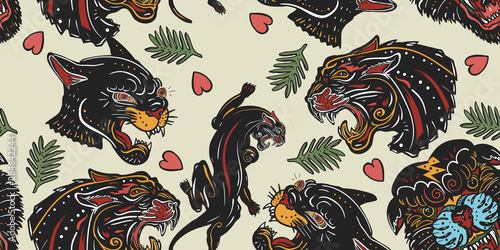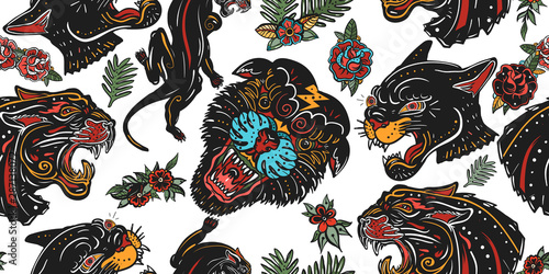 Black Panthers Seamless Pattern Old School Tattoo Style Wild