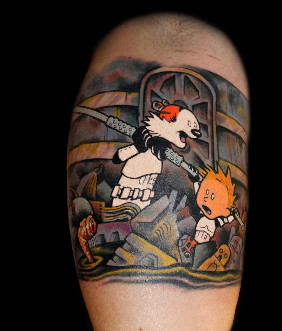 I met with khalid beforehand to make sure he could reproduce it from the picture and we discussed size placement color price etc. Chris 51 continues his epic tattoo mashups with this calvin hobbesstar wars piece. 29674 likes 204 talking about this.